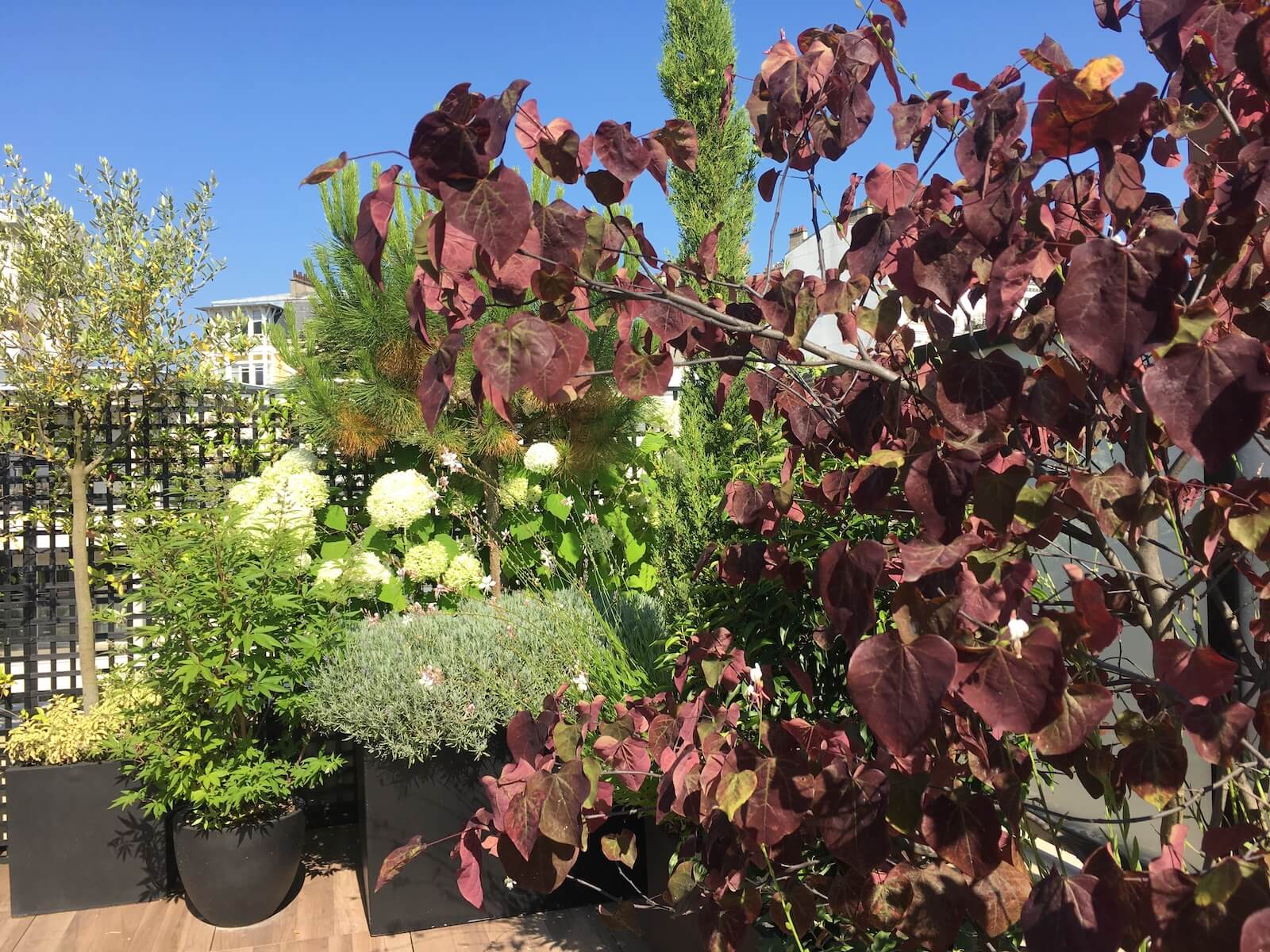 La terrasse est légèrement cloisonnée pour favoriser l’intimité et cadrer le regard vers le paysage, un paysage qui se présente et se découvre, d’abord une première ligne de graminées, qui donnent à voir le blond de leurs tiges étroites, puis des strates arbustives, rythmées de petits arbres qui s’étirent vers le ciel, une à gauche puis plus loin une à droite, puis au fond une strate centrale, couronnée d’un arbuste à port large.