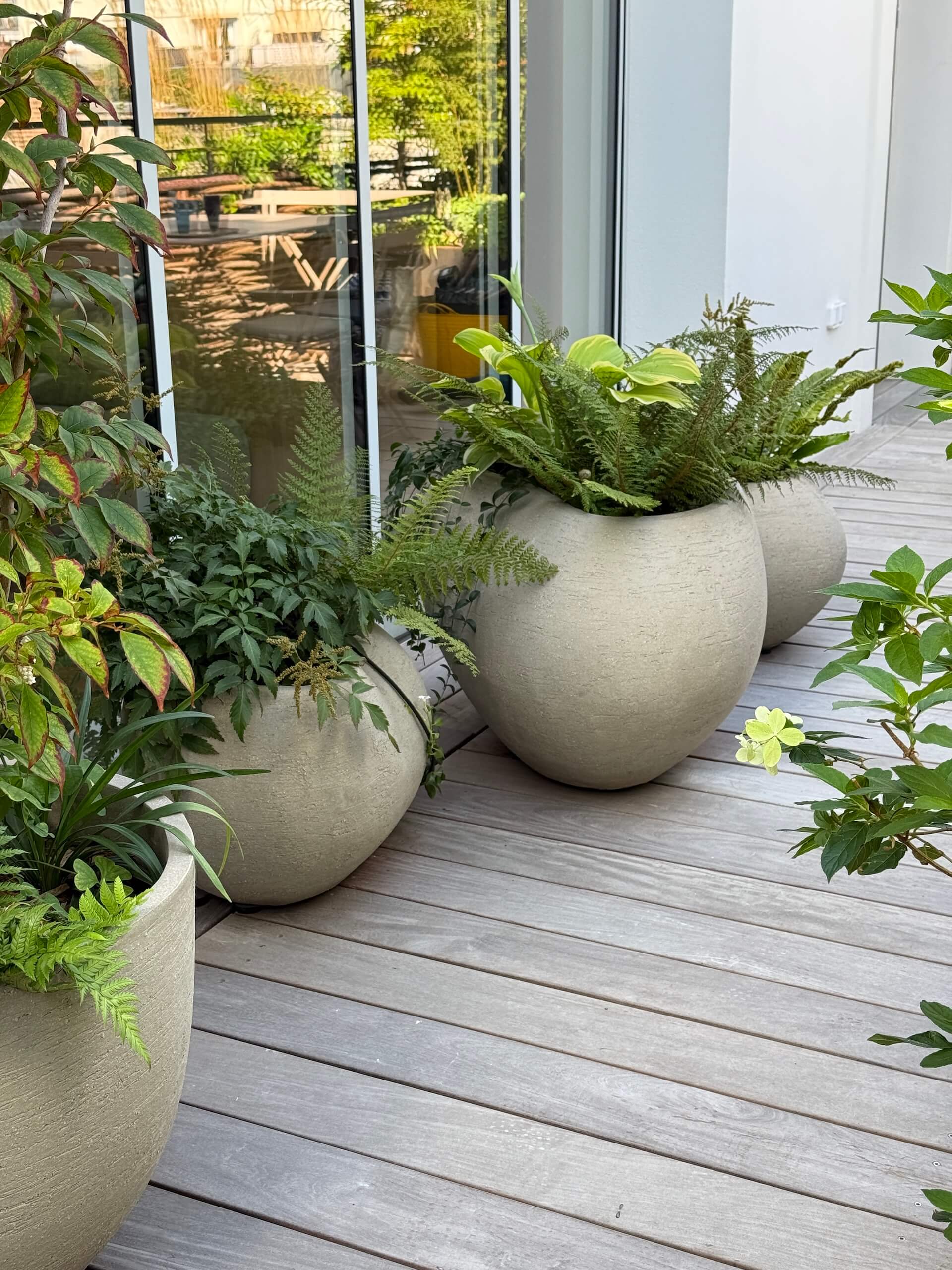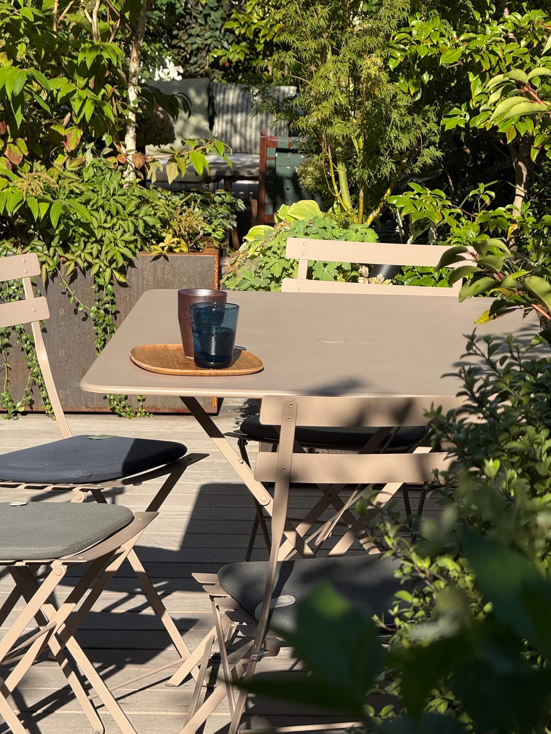 En complément, au centre de la terrasse, des bacs en acier corten assument la rupture entre les 2 parties de l’espace. Ici, le passage se ressert pour inciter le visiteur à chercher son chemin entre les feuillages. Cette disposition est la clé de voute de la composition puisque sa position centrale dans l’espace vient boucher les perspectives et ménager de la surprise dans la visite.