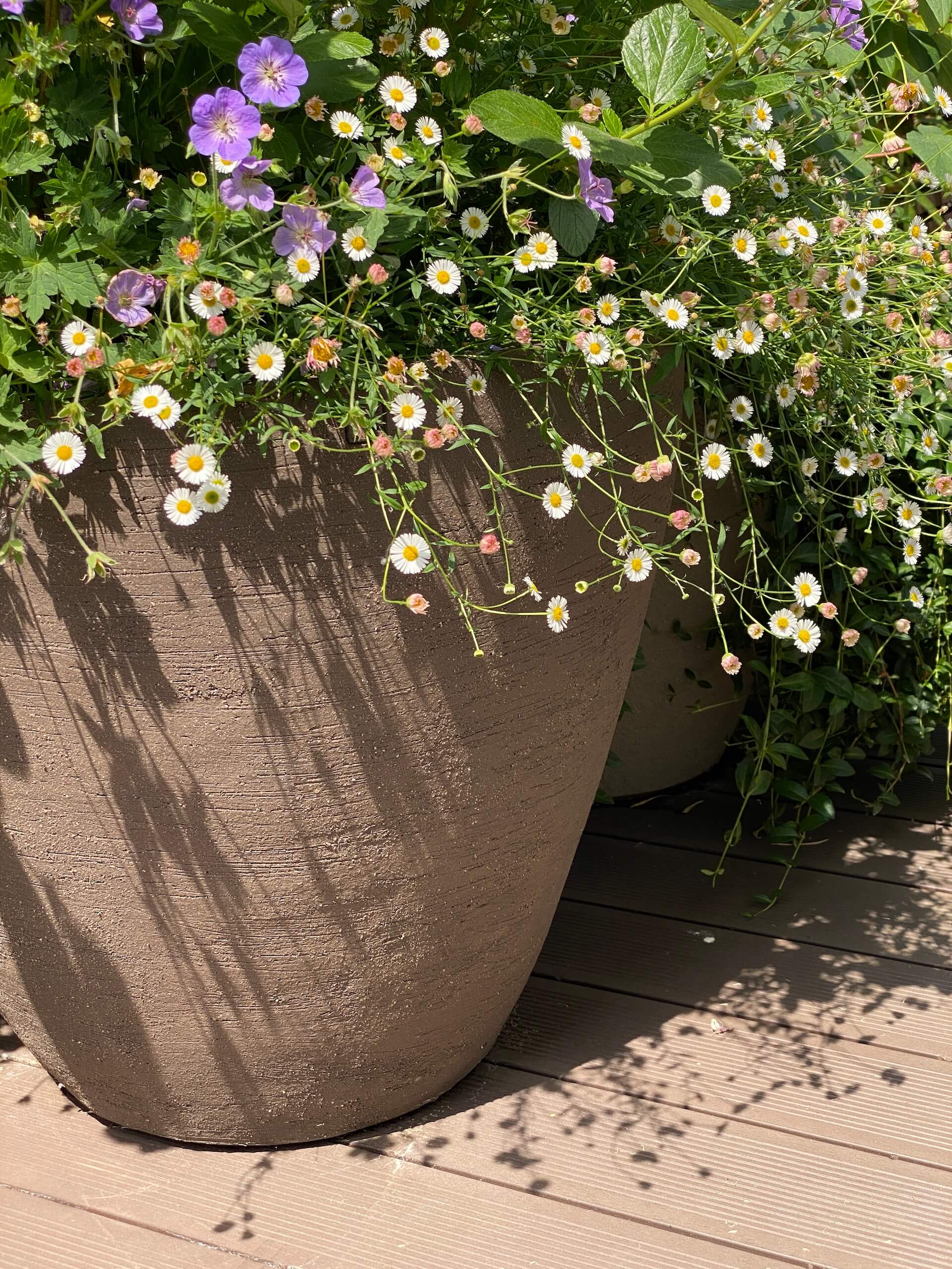 Plus loin, le couloir étroit devient promenade. Des poteries de tailles, formes et couleurs variées rythment le chemin, tantôt côté façade, tantôt côté garde-corps. Elles dessinent une ondulation qui invite à contourner, découvrir, progresser.