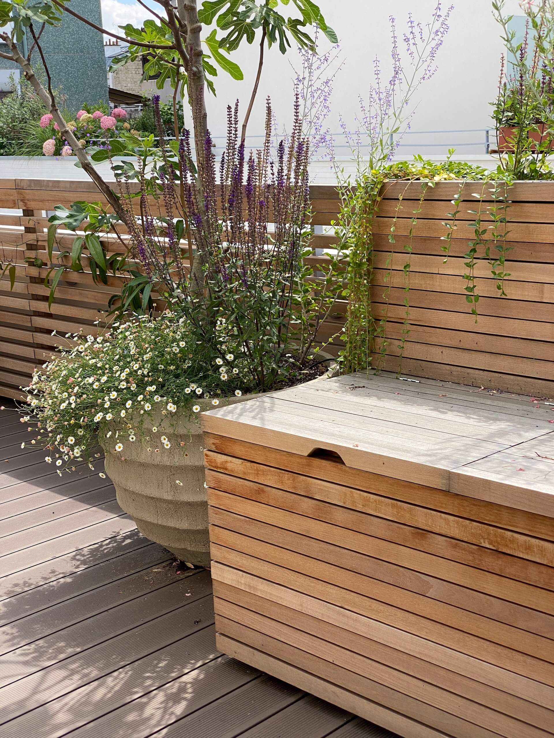La grande terrasse, autrefois vide et ouverte, se pare d’une composition épurée qui révèle sa morphologie en L. Deux espaces s’y dessinent, deux atmosphères complémentaires, illustrant tout l’art d’un aménagement de terrasse pensé dans le détail.